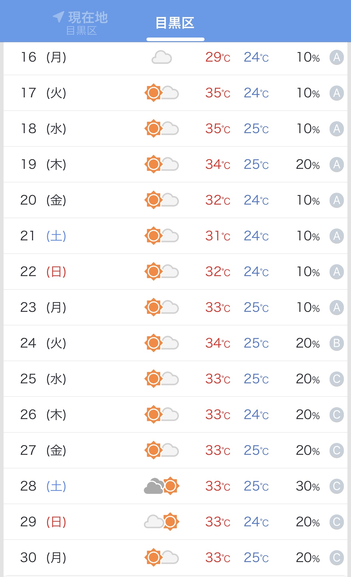 これから、ムシムシじめじめした時期が当分続くのかぁ。。と思いながら、お天気アプリで目黒区の週間天気を調べてみてビックリ!全然雨が降る気配がない(笑)